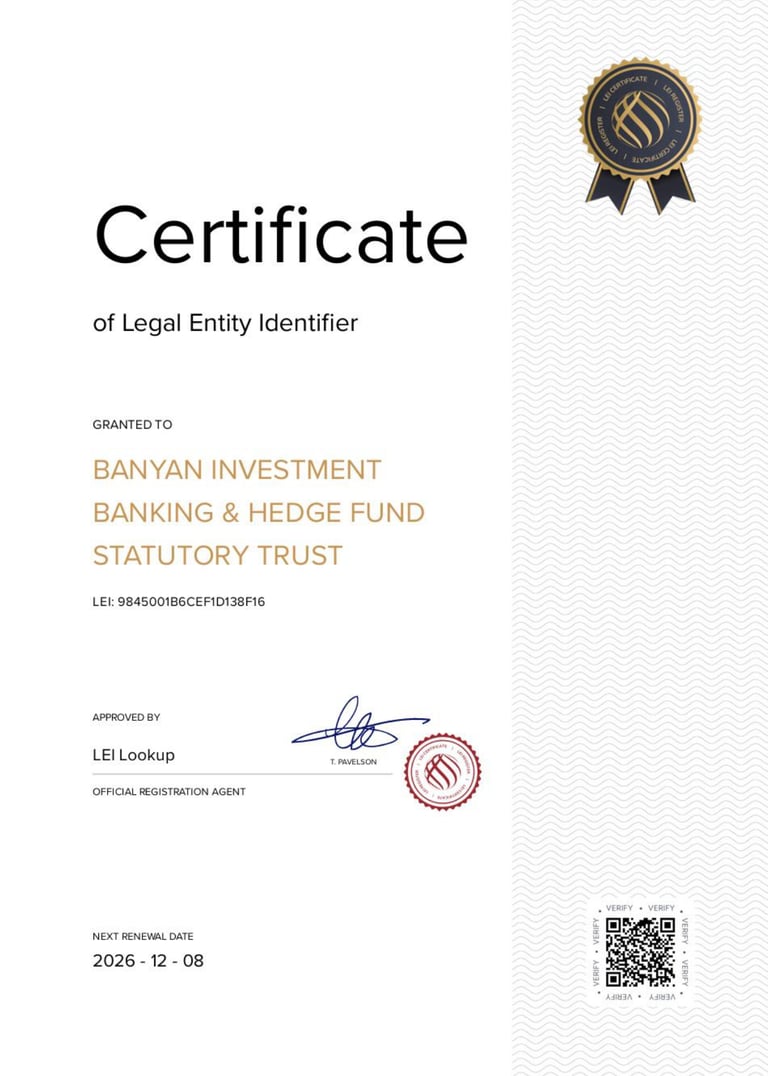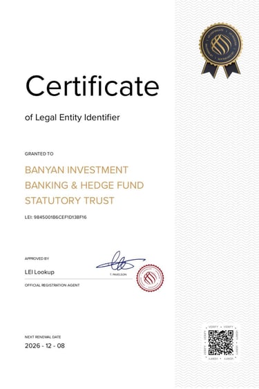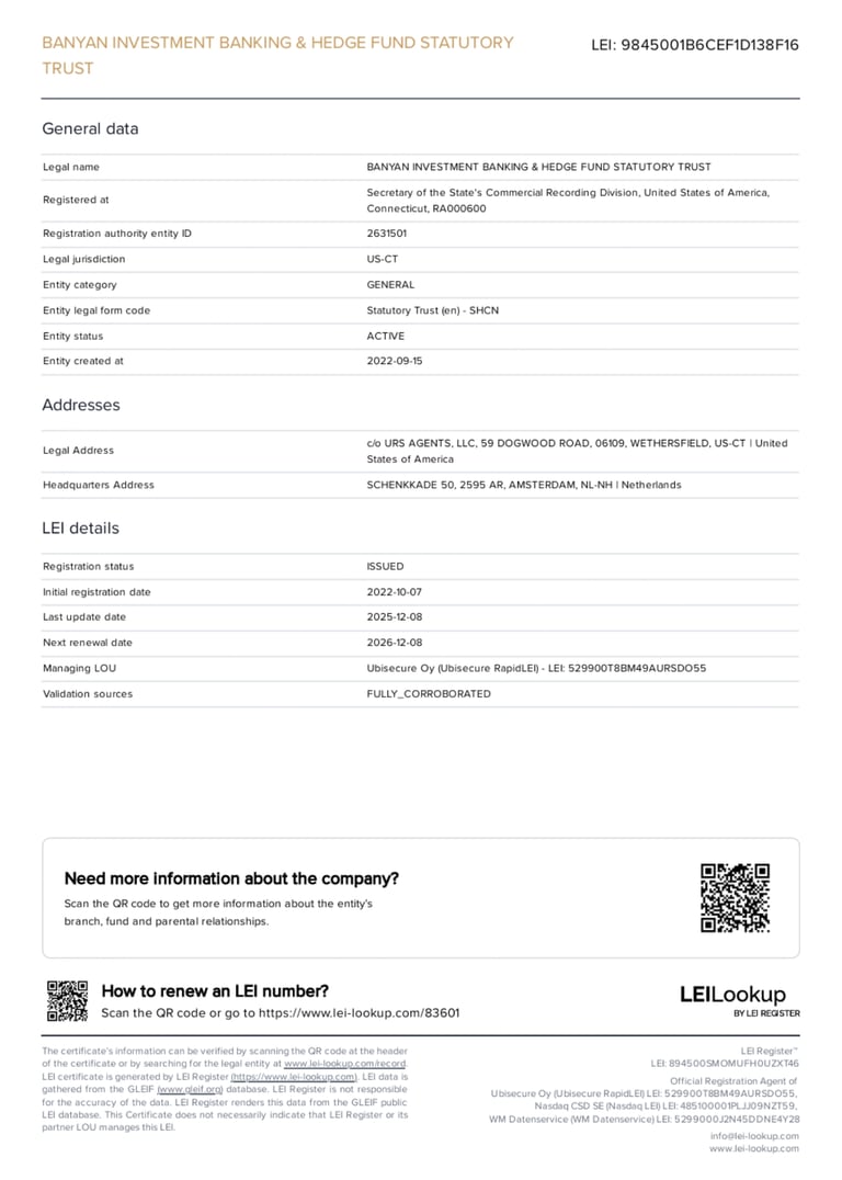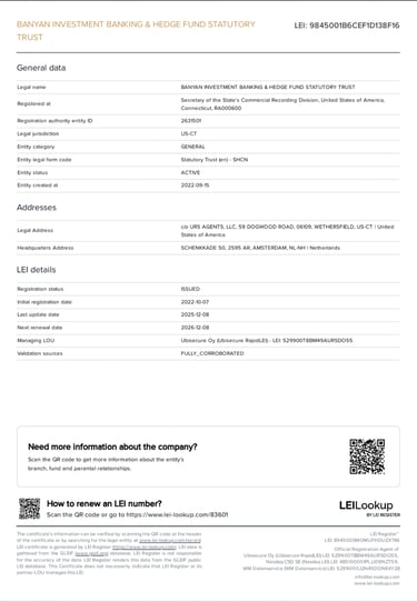 The LEI Certificate for Banyan Investment Banking & Hedge Fund Statutory Trust confirms the entity's unique Legal Entity Identifier (LEI): 9845001B6CEF1D138F16, which is essential for financial transparency and global identification in financial transactions. This entity, registered in Connecticut, USA, with headquarters in Amsterdam, Netherlands, maintains an active LEI status. Initially registered on October 7, 2022, and fully corroborated, the certificate is valid until its next renewal date on October 23, 2025. Banyan Investment Bank Hedge Fund